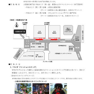 この企画は、2月17日(月)から23日(日・祝)の期間、大阪駅前地下道の中央エリア(東・西)の壁面とイベントスペースを活用し、未来を担う若手クリエイター(大阪文化服装学院・マロニエファッションデザイン専門学校の学生)たちの感性と梅田のまちを融合させた、梅田発の未来に向けたコラボレーション企画として実施するものです。